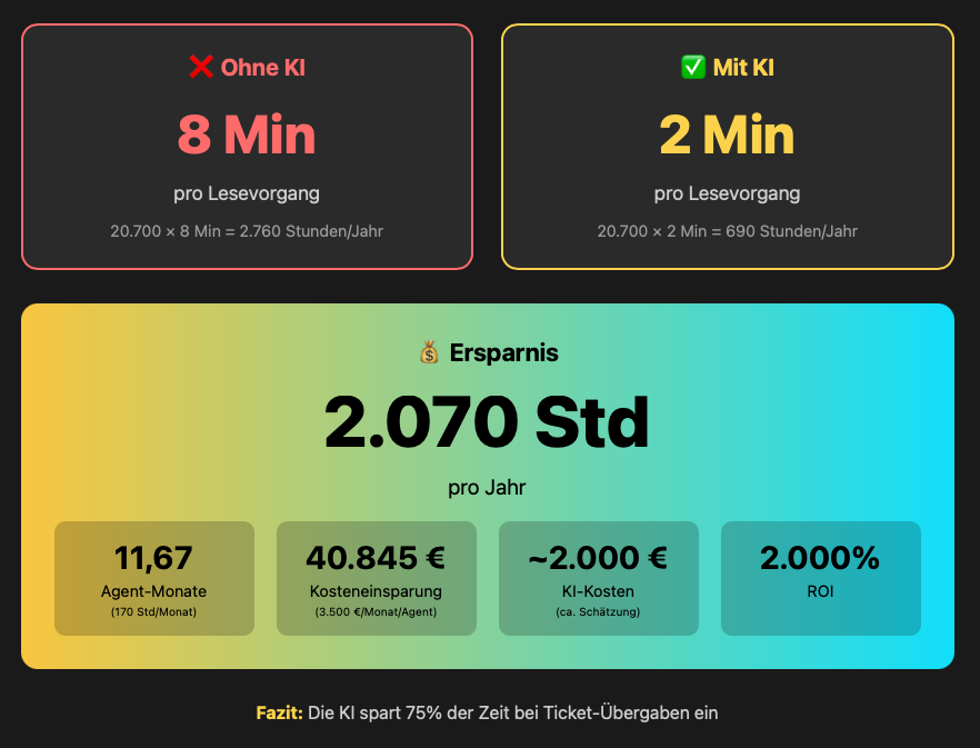 Realistisch gesehen müssen etwa 45 % aller Tickets an den Second-Level-Support oder andere Agenten weitergeleitet werden. Das bedeutet, dass diese Tickets mindestens 2x gelesen und zusammengefasst werden: einmal bei der Weiterleitung und einmal bei der Übernahme. Die folgende Beispielrechnung zeigt den damit verbundenen Aufwand bei einer angenommenen Anzahl von 23.000 Tickets pro Jahr – mit und ohne KI-Zusammenfassung: