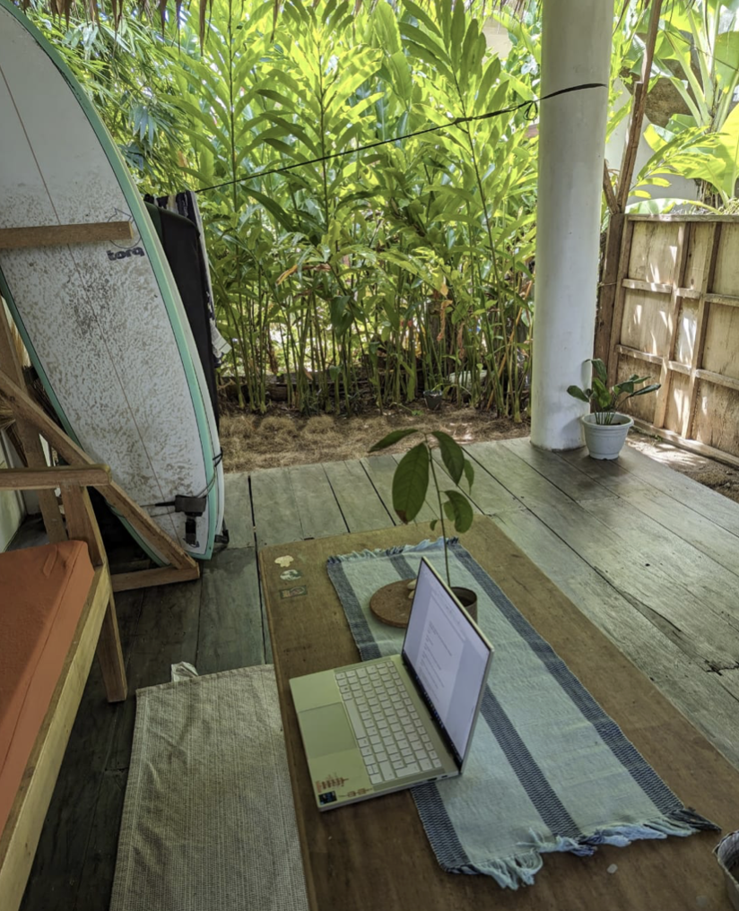 I don't like sitting at desks 😬 Due to my travels, my workspace is constantly changing: sometimes in a cafe, sometimes at home, sometimes in a co-working space. A change of scenery is a must for me.