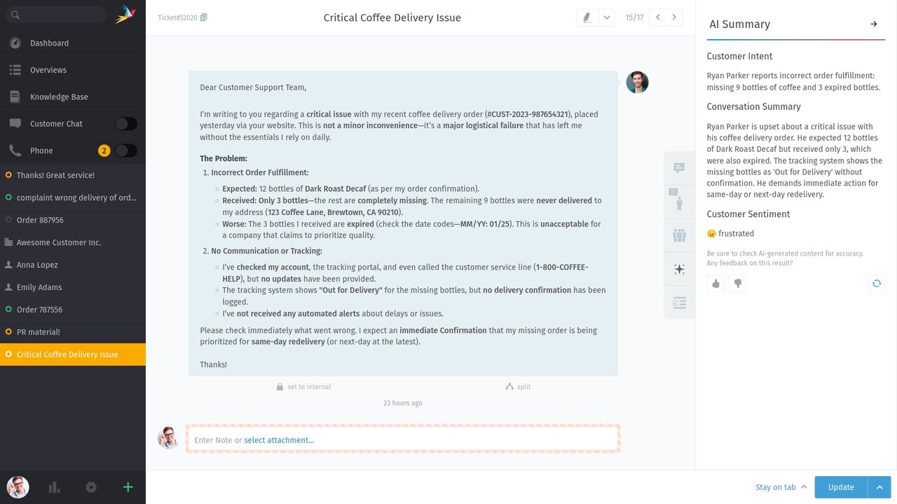 Long ticket histories take time. With the AI summary, agents can get a precise overview of the conversation so far and the core issues of a case with just one click. This ensures immediate knowledge transfer, especially during handovers or escalations, without having to manually review pages of communication history.
